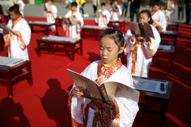 9日,60名學齡兒童在西安漢城湖參加了第五屆「開筆禮」活動。「開筆禮」是中國傳統文化中兒童開始識字習禮的一種啟蒙教育形式,共分奉茶禮、正衣冠、禮謝親師等。 中新社
