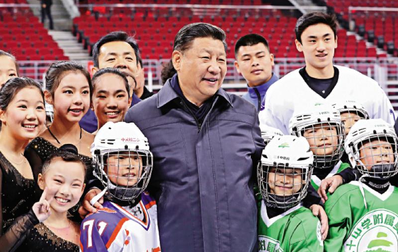 圖:24日,中共中央總書記、國家主席、中央軍委主席習近平在北京五棵松體育中心考察時和青少年冰球和隊列滑愛好者們合照 新華視點
