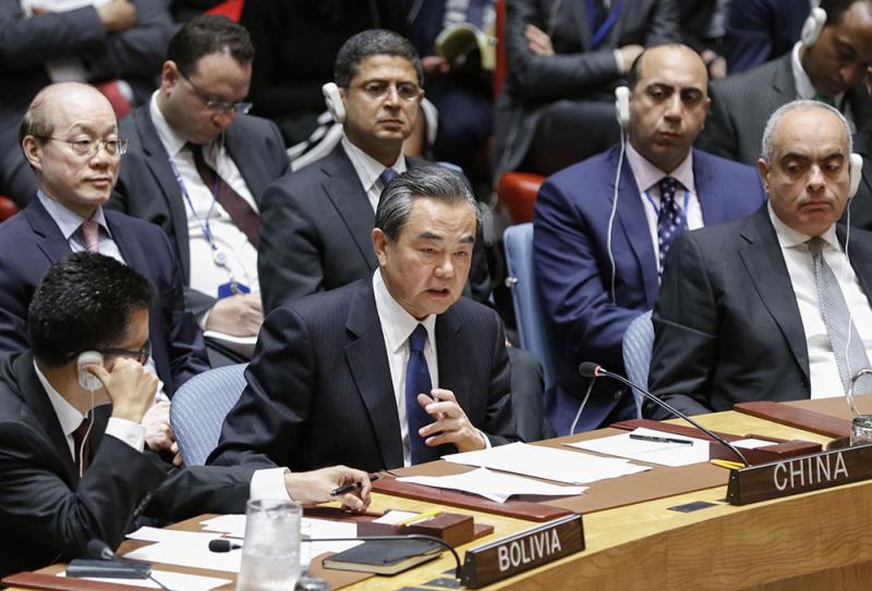 圖:28日,外交部長王毅在紐約出席聯合國安理會朝鮮半島核問題部長級公開會,代表中方發言 中新社