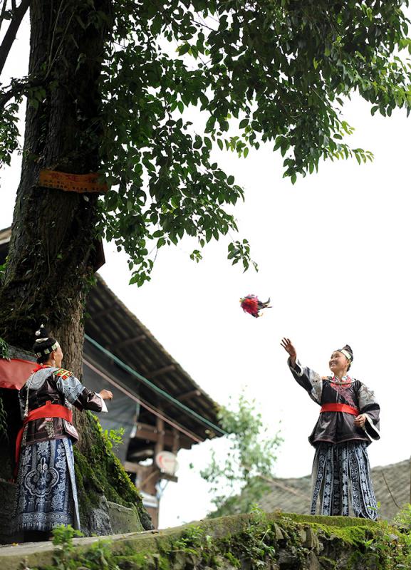 12日,貴州省丹寨縣龍泉鎮高寨村的水族村民進行打手毽活動。打手毽是貴州苗族、水族同胞喜愛的傳統體育項目,手毽約長50厘米,用雞毛紮成,內裝銅錢和銀元,外裹各種鮮艷布條或毛線。兩名選手用手來回擊打手毽,固定時間內手毽落地次數多的一方為敗。逢年過節,打手毽是當地男女青年喜歡用於交流情感的社交方式。 (新華社)