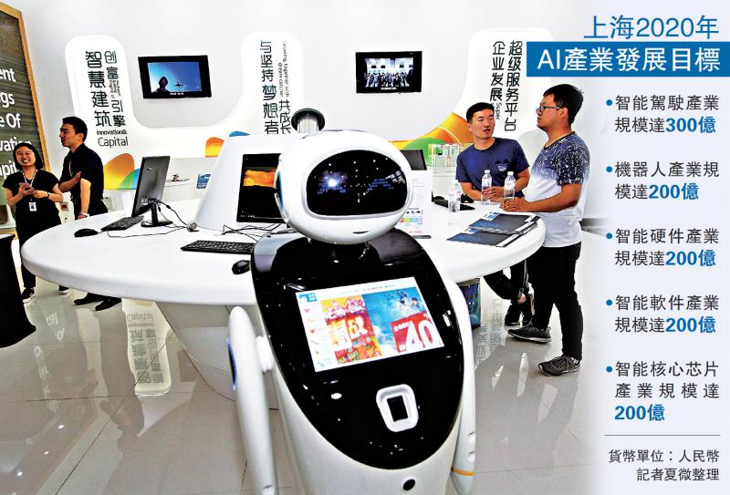 14日,上海市政府新聞發布會上,上海市經濟信息化委主任陳鳴波介紹了新出台的《關於本市推動新一代人工智能發展的實施意見》(下稱《意見》)主要內容。《意見》指出,到2020年,上海將「基本形成與超大型城市運行相適應的人工智能深度應用格局」,建成約5個人工智能特色產業集聚區,人工智能重點產業規模要超過1000億元(人民幣,下同),並將成為新時代經濟增長點。/大公報記者夏微上海報道