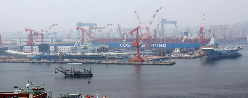 伴隨遼寧艦返回大連造船廠,中國兩艘航母實現了歷史性「同框」。28日記者看到,遼寧艦靠泊在乾船塢一側,艦尾軍旗迎風招展;國產航母則正在塢內舾裝(指船體主要結構完成後,機械、電器、電子設備等的安裝),艦橋附近重新搭起腳手架,起重吊車再次開上甲板,工人正對艦首部位的塗裝進行清理。有船用防爆風機再次亮相甲板,其目的是排除艙內有毒、有害和易燃氣體。 (記者 宋偉)