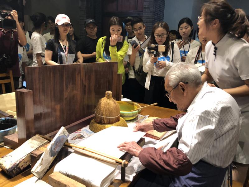 現場製作木版年畫,欣賞精美絕倫的汴繡,體驗大宋官瓷製作,漫遊古都老字號……6月14日,「2018范長江行動──中原行」香港傳媒學子一行走進開封文化客廳以及開封博物館,與多名非遺傳承人零距離接觸,感受工藝大師的精湛技藝和高超水平。當中,他們更採訪了學藝八十載、現年93歲的首批國家級非物質文化遺產朱仙鎮木版年畫的傳承人郭太運,聆聽大師細訴近現代朱仙鎮木版年畫的榮衰轉變。大公報實習記者 鍾一鳴、張瑞洋開封報道