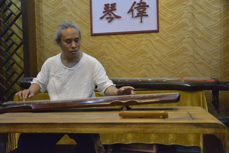 圖:非遺傳承人湯紅偉在演奏古琴 大公報實習記者韓偉攝