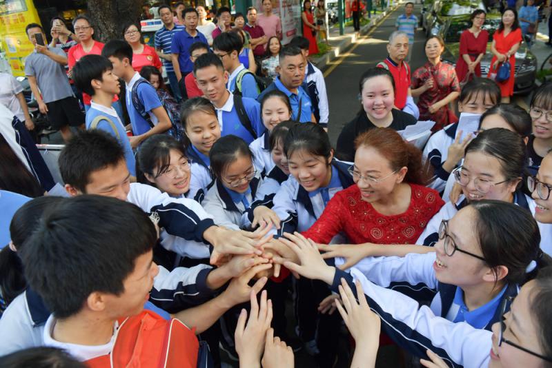 圖:6月7日,在2019年全國高考深圳市福田中學考點,老師與考生一起加油\中新社