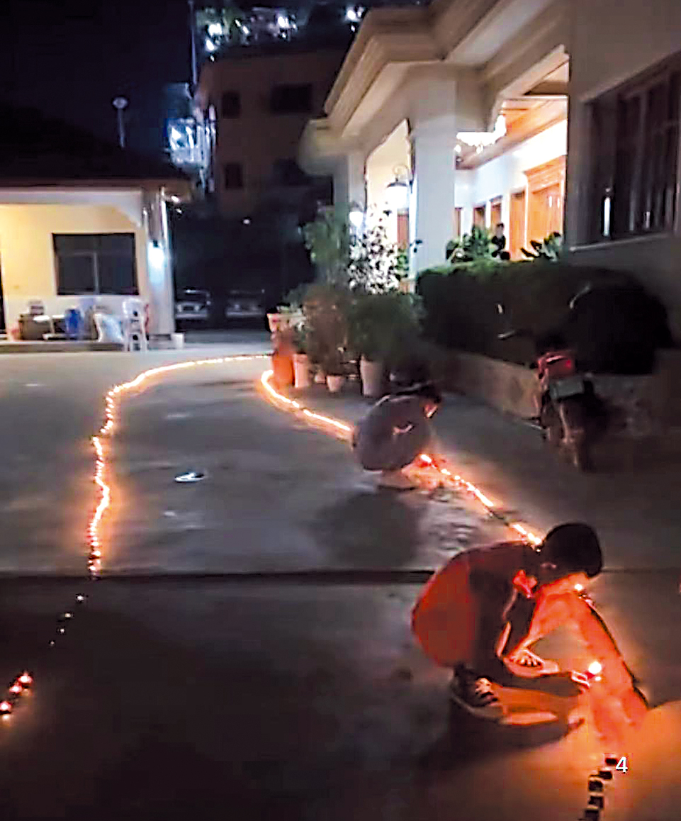 图:有失联乘客家属在家门口点燃数百根蜡烛,为亲友祈福。