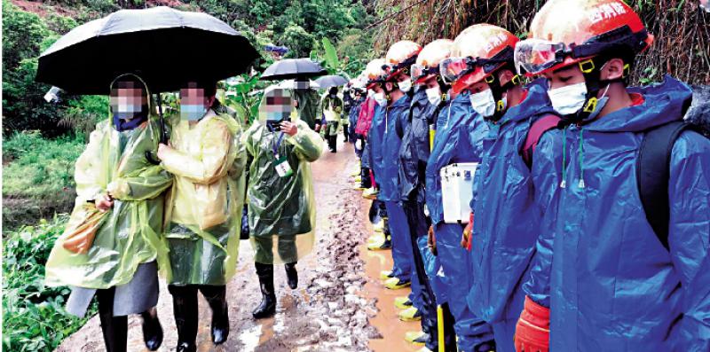 圖:3月24日,消防救援人員肅立在道路兩旁,向前往現場的失聯乘客家屬行禮。\新華社