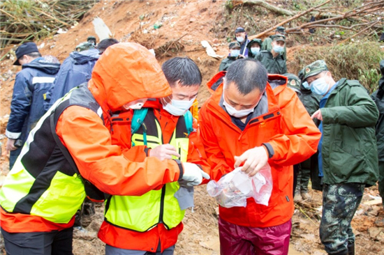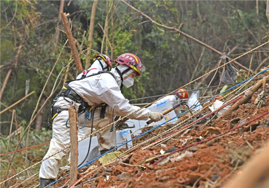 在廣西梧州藤縣東航MU5735航班墜機事故現場核心區,民航專家現場檢測確認黑匣子。新華社鄭炳鎮攝
