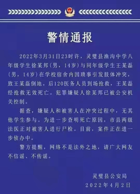 4月2日靈璧縣公安局發布通報,3月31日23時許,安徽靈璧縣漁溝中學八年級學生徐某邦(男,14歲)與同年級學生王某磊(男,14歲)在學校宿舍內因瑣事引發肢體衝突,致王某磊倒地。後120醫務人員到場搶救,王某磊經搶救無效死亡。犯罪嫌疑人徐某邦已被公安機關控制。