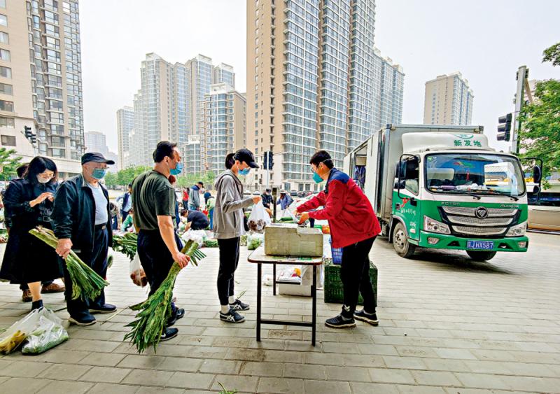 圖:4月25日,北京市朝陽區雙井街道一處空地上,新發地市場的蔬菜直供小區。\中新社