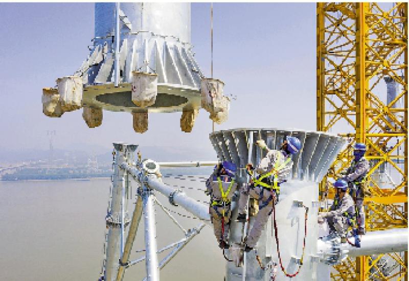 圖:5月25日,安徽送變電工程公司施工人員在長江大跨越施工現場作業。\新華社