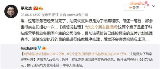 此後,羅永浩個人微博轉發上述內容,並稱:「這筆債務已經支付完了,法院恢復執行是為了結案程序。每還一筆錢,都會害得親友們擔心一次……」