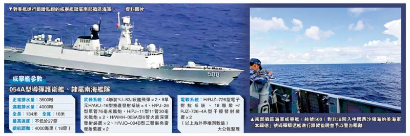 左圖:對美艦進行跟蹤監視的咸寧艦隸屬南部戰區海軍。資料圖片;右圖:南部戰區海軍咸寧艦(舷號500)對非法闖入中國西沙領海的美海軍「本福德」號導彈驅逐艦進行跟蹤監視並予以警告驅離。