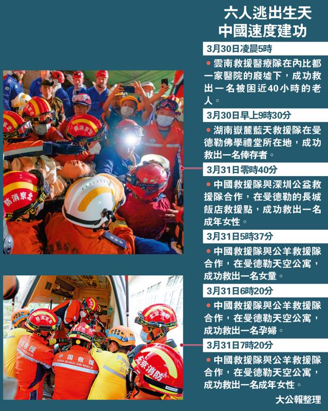 •中國救援隊與深圳公益救援隊合作,在曼德勒的長城飯店救援點,成功救出一名成年女性。