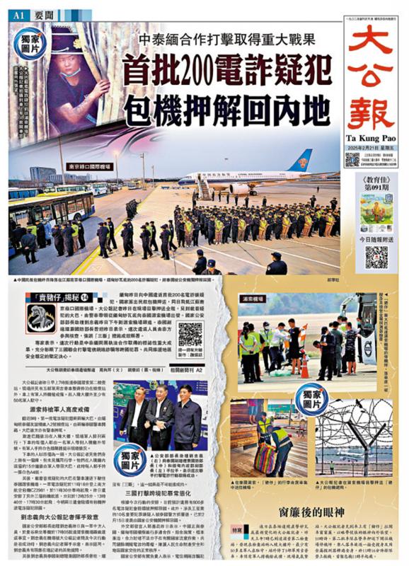 圖:2025年2月21日,《大公報》對中泰緬合作打擊電詐進行深入報道。
