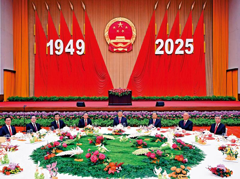 【大公報訊】據新華社報道:人民大會堂宴會廳華燈璀璨,洋溢着喜慶熱烈的節日氛圍。主席台上方高懸着莊嚴的國徽,「1949-2025」大字年號在鮮艷紅旗映襯下格外醒目。