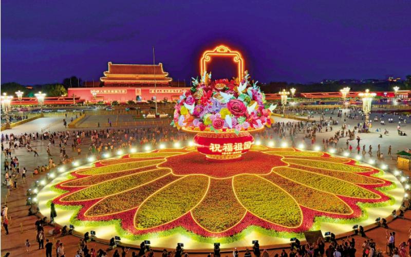 圖:10月1日,全國民眾歡度國慶佳節。圖為日前在北京天安門廣場拍攝的「祝福祖國」大花籃夜景。\新華社