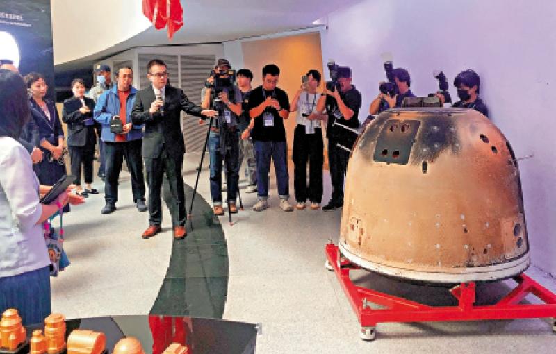 圖:「無盡探索:中國的航天、航空及航海」展覽展出嫦娥六號返回艙及降落傘實物。\大公報記者方俊明攝