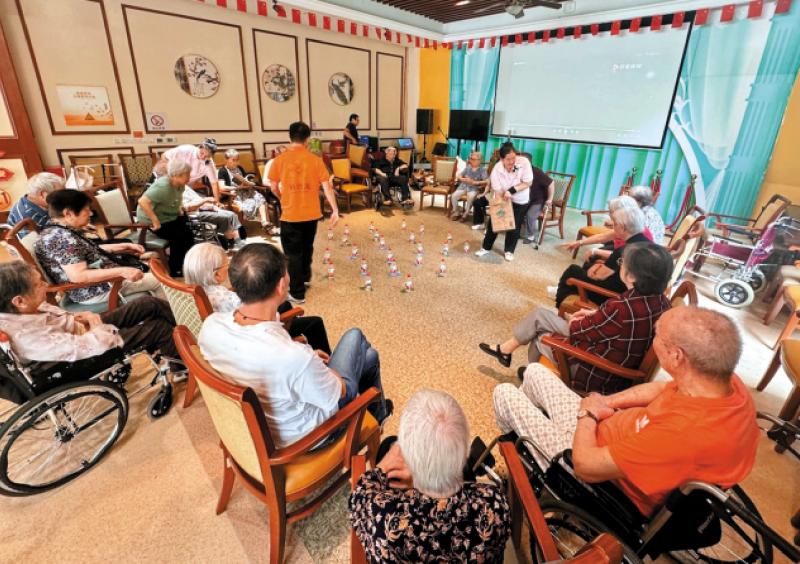 圖﹕在香港養老資源緊張、本地院舍輪候時間延長的背景下,北上養老成為越來越多長者的現實選擇。圖為椿萱茂(廣州科林路)老年公寓的公共活動區,老人們正準備玩遊戲。\大公報記者李紫妍攝