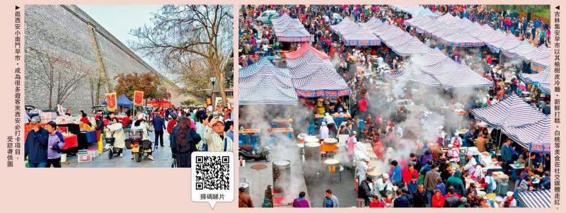 左圖:逛西安小南門早市,成為很多遊客來西安必打卡項目。\受訪者供圖;右圖:吉林集安早市以其榆樹皮冷麵、新鮮打糕、白桃等美食在社交媒體走紅。