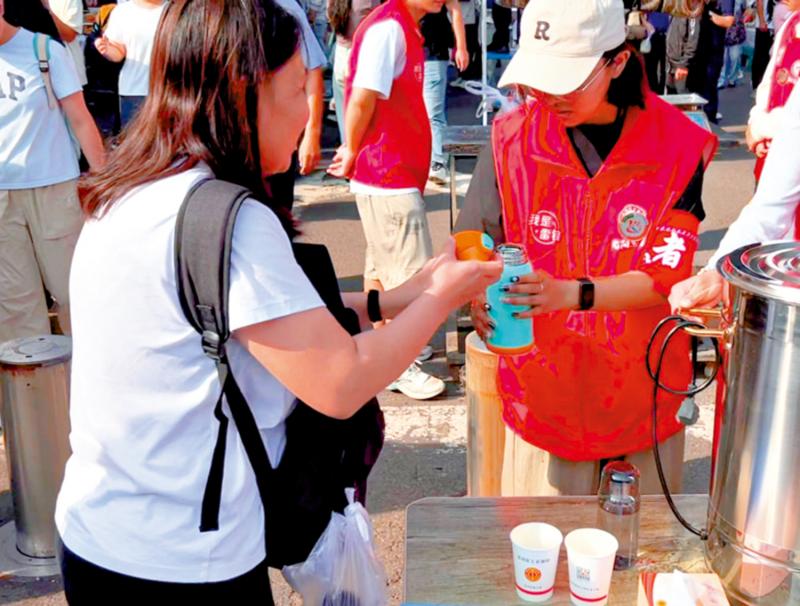 圖:小河沿早市志願者為遊客提供熱水服務。\大公報記者于珈琳攝