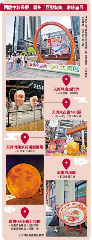 一輪金黃色的「超級月亮」、巨型「廣東省櫈」紅膠櫈、巨型網球拍、巨幅五星紅旗及紅心氣球、巨大的全運會吉祥物喜洋洋與樂融融……這個國慶中秋「雙節」長假,廣州各大商圈被這些創意十足的「巨型裝飾」強勢刷屏,成為市民遊客爭相打卡的熱點。