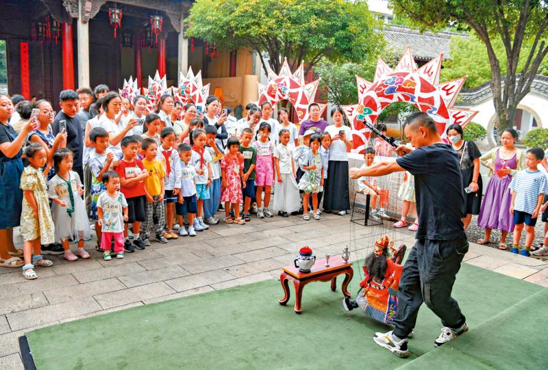 圖:10月1日,在浙江省金華市非遺館,浙江婺劇藝術研究院演員為遊客表演提線木偶戲《鍾馗醉酒》。\新華社