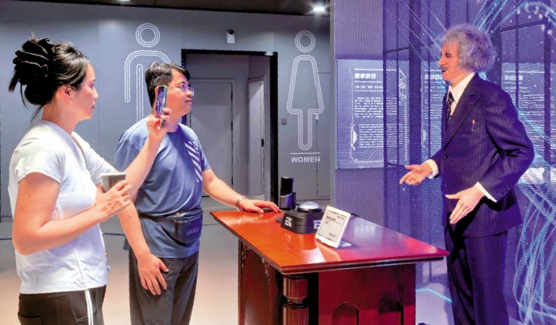 展示區裏仿生人形機器人「愛因斯坦」頗受關注,只見「他」身着筆挺的西裝,表情認真、笑容溫和地講解科學知識,現場觀眾通過多種語言與其互動,「他」全部對答如流,舉手投足間儼然是一位資深教授在現場演講。