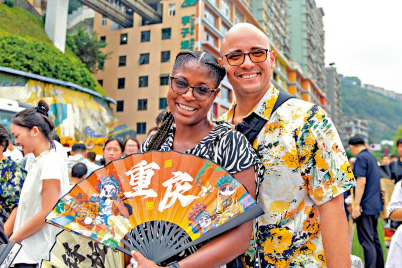 圖:3日,兩名加拿大遊客在重慶市渝中區李子壩遊玩。\新華社