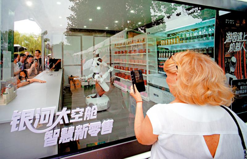 圖:外國遊客在北京頤和園的一家機器人零售店門外觀看機器人服務。\中新社