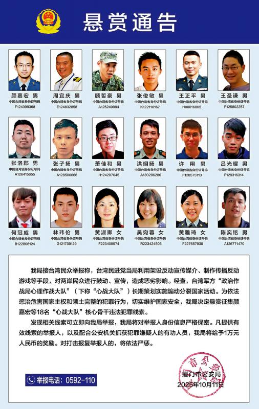 福建省廈門市公安局11日發布懸賞通告,徵集顏嘉宏等18名台灣軍方「政治作戰局心理作戰大隊」(以下簡稱「心戰大隊」)核心骨幹違法犯罪線索。