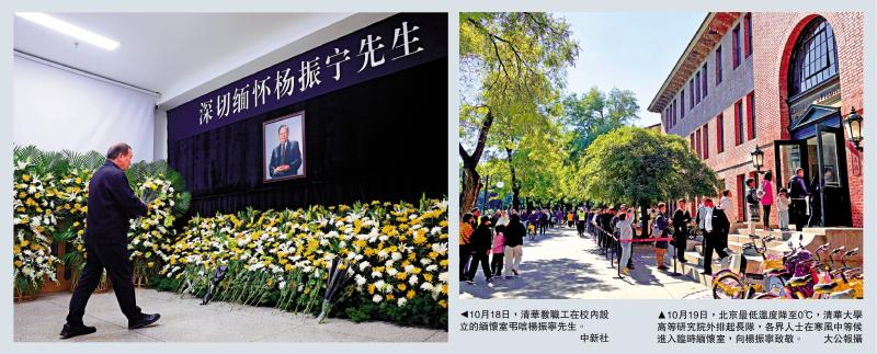 左圖:10月18日,清華教職工在校內設立的緬懷室弔唁楊振寧先生。\中新社;右圖:10月19日,北京最低溫度降至0℃,清華大學高等研究院外排起長隊,各界人士在寒風中等候進入臨時緬懷室,向楊振寧致敬。\大公報攝