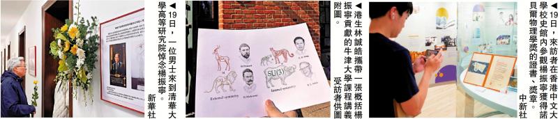 圖:(左起)19日,一位男士來到清華大學高等研究院悼念楊振寧。\新華社;港生林誠皓攜帶一張概括楊振寧貢獻的牛津大學課程講義附圖。\受訪者供圖;19日,來訪者在香港中文大學校史館內參觀楊振寧獲得諾貝爾物理學獎的證書、獎章。\中新社