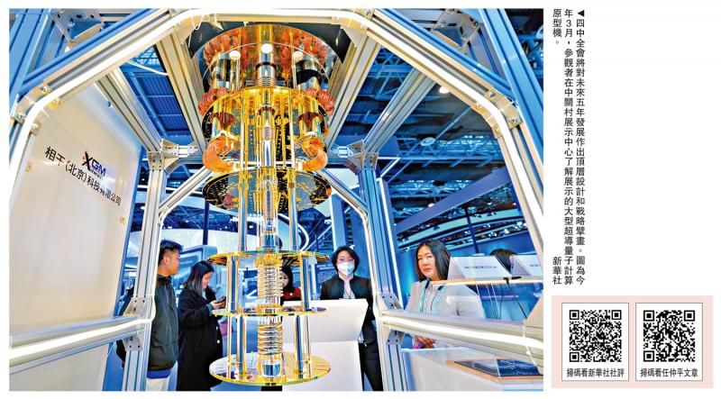 圖:四中全會將對未來五年發展作出頂層設計和戰略擘畫。圖為今年3月,參觀者在中關村展示中心了解展示的大型超導量子計算原型機。\新華社