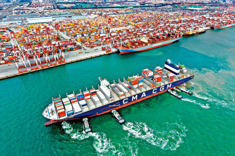 圖:海外輿論期待中國繼續擴大對外開放。圖為20日,一艘貨輪在山東港口青島港停靠集裝箱碼頭。\新華社