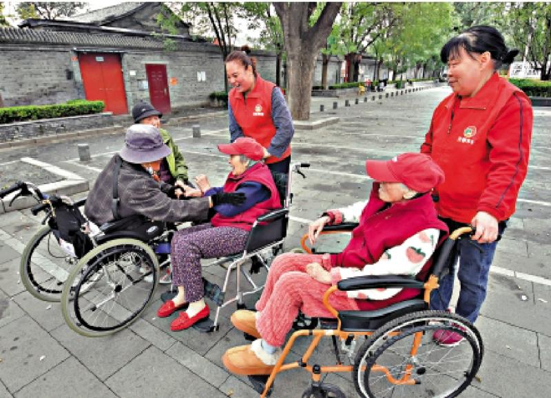 圖:民眾期待政策扶持養老服務。圖為北京市芙蓉養老照料中心的護理人員推着老人在戶外活動。\新華社