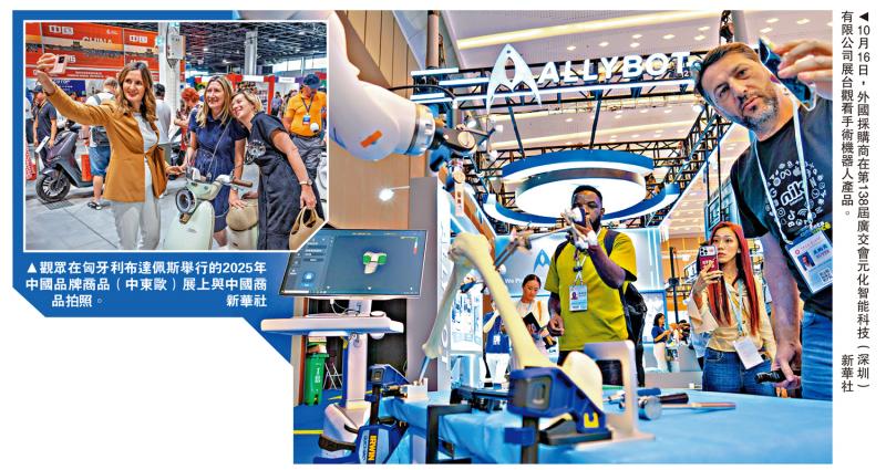 左圖:觀眾在匈牙利布達佩斯舉行的2025年中國品牌商品(中東歐)展上與中國商品拍照。右圖:10月16日,外國採購商在第138屆廣交會元化智能科技(深圳)有限公司展台觀看手術機器人產品。\新華社