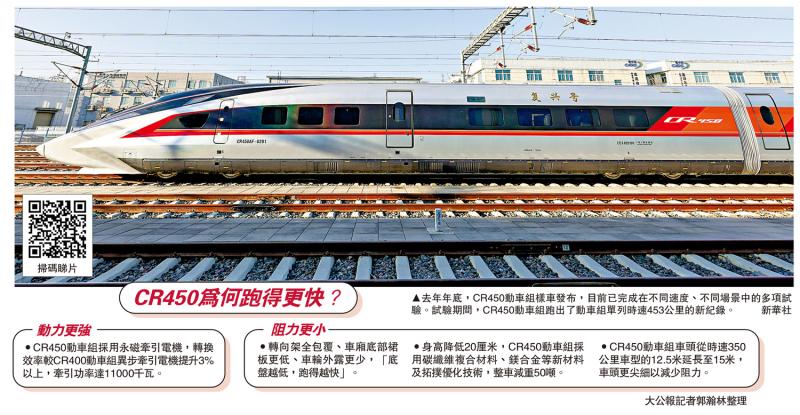 圖:去年年底,CR450動車組樣車發布,目前已完成在不同速度、不同場景中的多項試驗。試驗期間,CR450動車組跑出了動車組單列時速453公里的新紀錄。 新華社