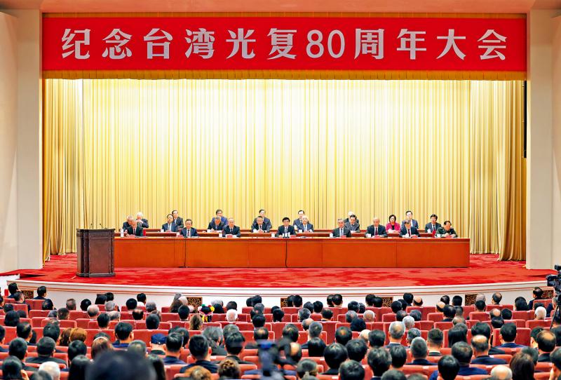 圖:10月25日,紀念台灣光復80周年大會在北京召開。中共中央政治局常委、全國政協主席王滬寧出席並講話。\新華社