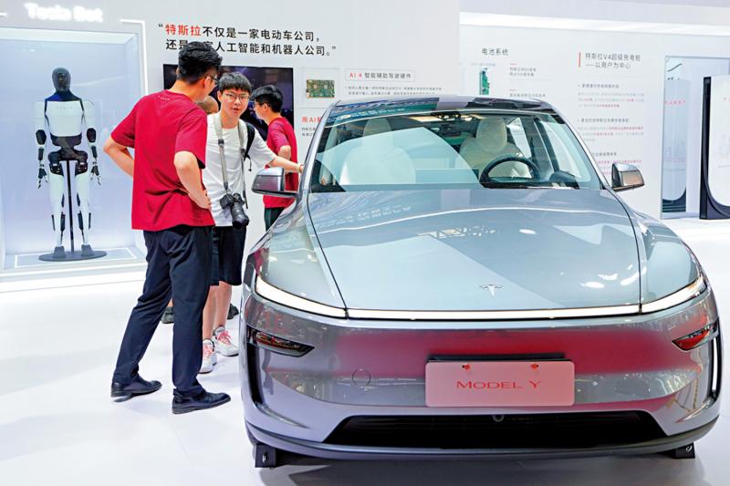 圖:中國新能源汽車產業與世界「鏈接」,共進共贏。圖為北京鏈博會上展出的特斯拉電動汽車。\新華社