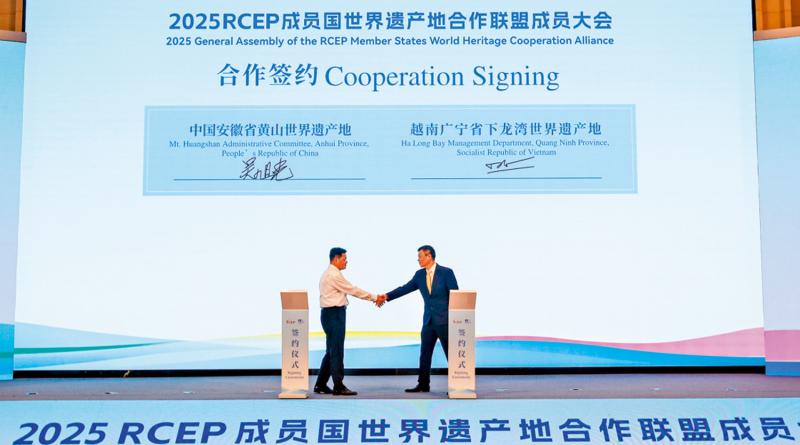 圖:10月17日,在2025RCEP成員國世界遺產地合作聯盟成員大會現場,黃山風景區和越南下龍灣雙方代表在合作簽約儀式中握手。\新華社