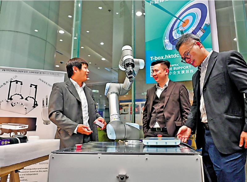圖:「十五五」期間,香港要主動融入國家發展大局,加快布局人工智能等領域。圖為參展商在香港國際創科展上展示協作機器人。\中新社