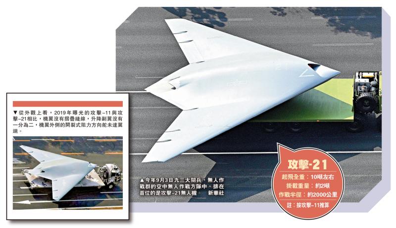 左圖:從外觀上看,2019年曝光的攻擊-11與攻擊-21相比,機翼沒有摺疊縫線,升降副翼沒有一分為二,機翼外側的開裂式阻力方向舵未達翼端。右圖:今年9月3日九三大閱兵,無人作戰群的空中無人作戰方隊中,排在首位的是攻擊-21無人機。\新華社
