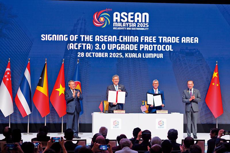 圖:當地時間10月28日,中國和東盟在馬來西亞吉隆坡簽署中國|東盟自貿區3.0版升級議定書。\中新社