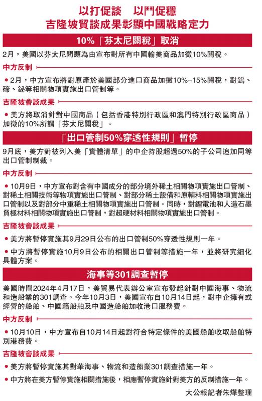 •美方將取消針對中國商品(包括香港特別行政區和澳門特別行政區商品)加徵的10%所謂「芬太尼關稅」。