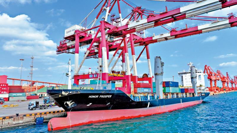 圖:山東青島港依託區位優勢,織密覆蓋日韓主要港口的海運網絡。圖為直達韓國仁川港的「泛奧升奧普輪」在青島港前灣港區裝卸集裝箱。\新華社