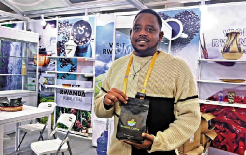 圖:來自盧旺達發展署的咖啡貿易代表Prince Muramba展示咖啡產品。\大公報記者張帆攝