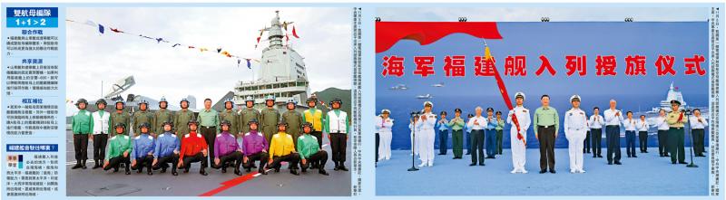 左圖:11月5日,我國第一艘電磁彈射型航空母艦福建艦入列授旗儀式在海南三亞某軍港舉行。中共中央總書記、國家主席、中央軍委主席習近平出席入列授旗儀式並登艦視察。這是習近平同艦載機飛行員、航空保障人員合影留念。右圖:11月5日,我國第一艘電磁彈射型航空母艦福建艦入列授旗儀式在海南三亞某軍港舉行。中共中央總書記、國家主席、中央軍委主席習近平出席入列授旗儀式並登艦視察。這是習近平向福建艦艦長、政治委員授予軍旗。\新華社