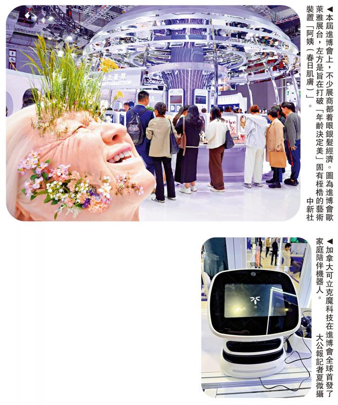 上圖:本屆進博會上,不少展商都着眼銀髮經濟。圖為進博會歐萊雅展台,左方是旨在打破「年齡決定美」固有桎梏的藝術裝置「阿姨(春日肌膚)」。\中新社;下圖:加拿大可立克魔科技在進博會全球首發了家庭陪伴機器人。\大公報記者夏微攝
