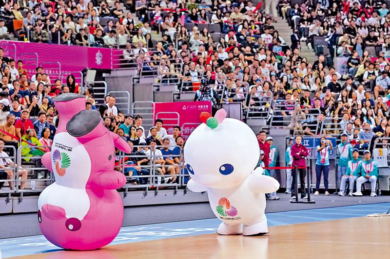 圖:8日,在東莞進行的全運會籃球賽間隙,被網友昵稱「大灣雞」的一對全運會吉祥物進行表演。\新華社